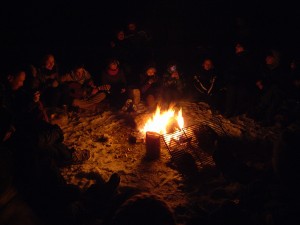 15分ほどの小屋へ歩く。みなが火を囲んで丸くなって座って