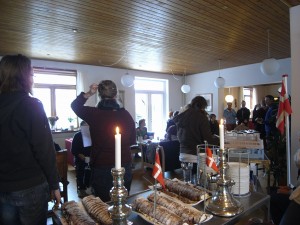 そして当日の朝,学校の庭に大きなデンマークの国旗がはたはたと揺らめく。