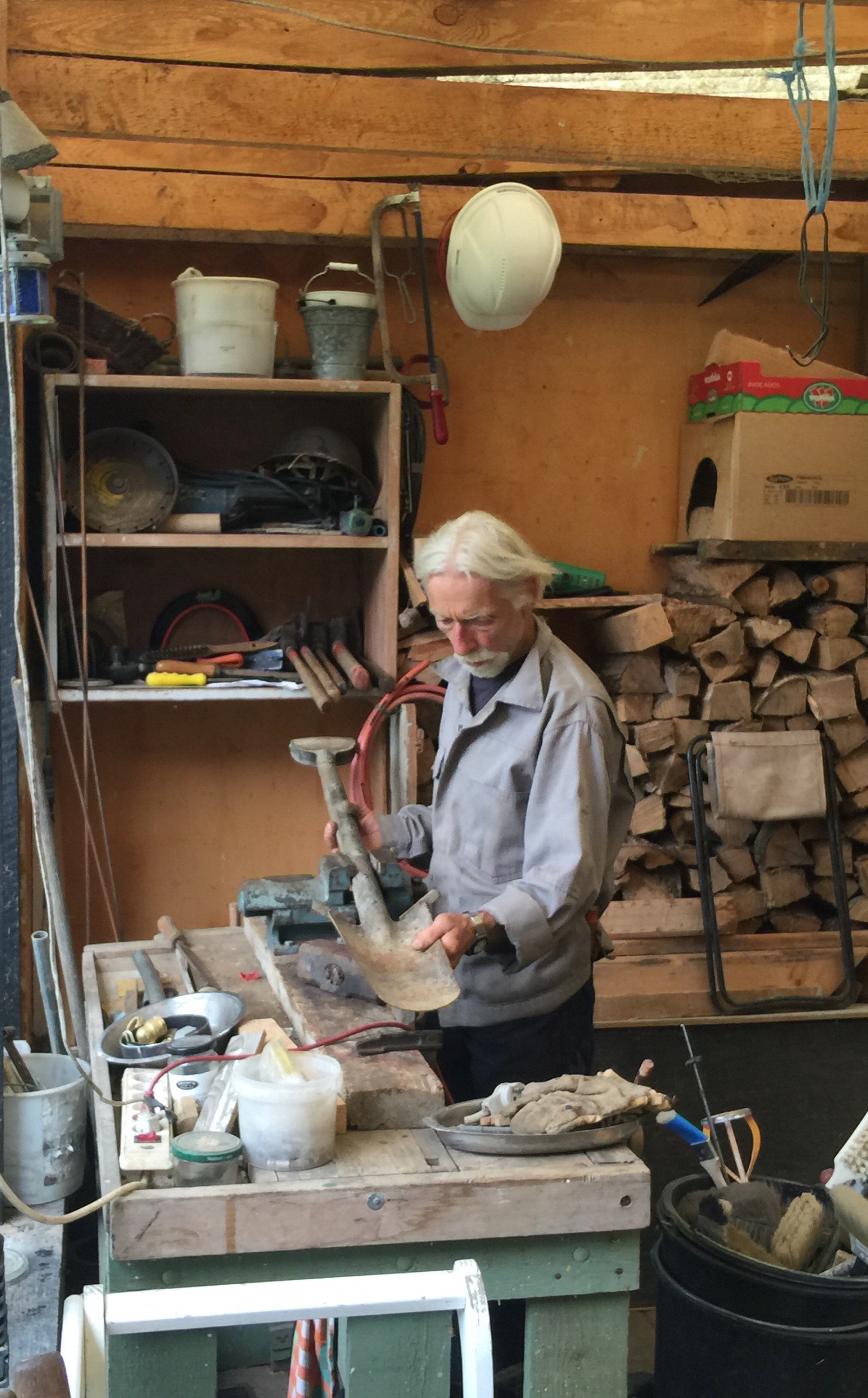 年季の入ったシャベルのような形のたいそう重い道具を真剣に研ぎ始めてる