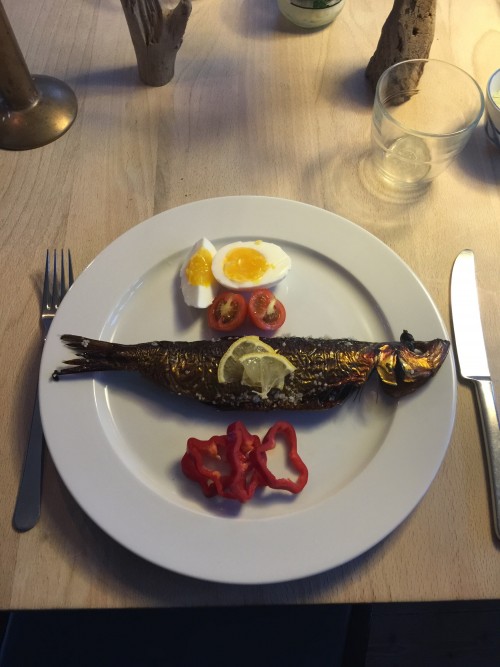 ボーンホルム島の燻製ニシンとライ麦パン、卵 という伝統的なよるご飯。おいしいニシン。